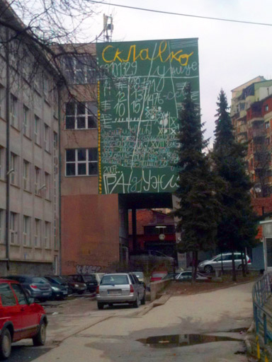 Leaving Užice, we walk past a mural painted by Aleksandar’s brother Ljudiša. The primary school wall depicts a Fish that ate the world, or rather, the entire history of wall painting: Lascaux caves, battle scenes, Egyptian tomb art, indigenous and tribal scenes. The entire cultural ancestry of humanity seen from the perspective of an artist from (then) former Yugoslavia. A few blocks down, the Teaching College building has a mural painted by Aleksandar two decades later. Written as if by child’s hand, it appears to keep score of a game. In fact, the marks and numbers record historic dates of Užice’s past. It ends with 2007, continuing to infinity. Perhaps Dimitrijević is not so far from Opalka after all.