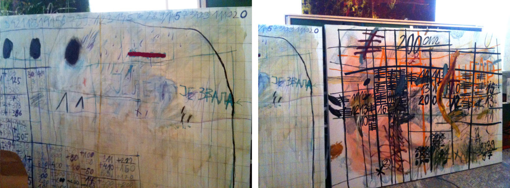 Dimitrijević uses diverse methods of application of paint (brush, broom, sponge, cloth) on varied backgrounds (canvas, hardboard, paper, wall) which he cuts, glues and fuses. Each painting is created over a period of time, and he frequently returns to the older paintings, changing and repainting them. He also uses found incidental drawings, rejected pieces of paper filled with records of game matches, doodles, signatures, pencil tests and other unconscious mark-making by ‘unknown authors’. For the artist, the value of these found drawings is partly their ‘worthlessness’ to their originators, who give them no value beyond the moment in which they were scribbled down. These found drawings, or Artefacts, are used as a base for his collages, installations or are enlarged onto larger works. Doodles and game scores are accurate templates of time spent doing nothing: of ticking away the valuable (or worthless) free time used for play, numerical variations played out as quickly as they are forgotten, serving only as permutations of killing time.