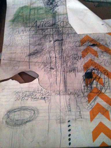 It’s an uncanny thing to step on artist’s work, even if encouraged; but Dimitrijević rips a large sheet out of the pile that lies about on the studio floor and offers me to trample on it. This work, and others on the said pile, are a part of the collection of works that are habitually stepped on, ripped or damaged. Footmarks, drips and other incidental markings that occur during work, he assures me, serve to complicate the authored mark-making. The works stay on the floor until they’re brought into collages, framed, overpainted, or incorporated in other pieces.